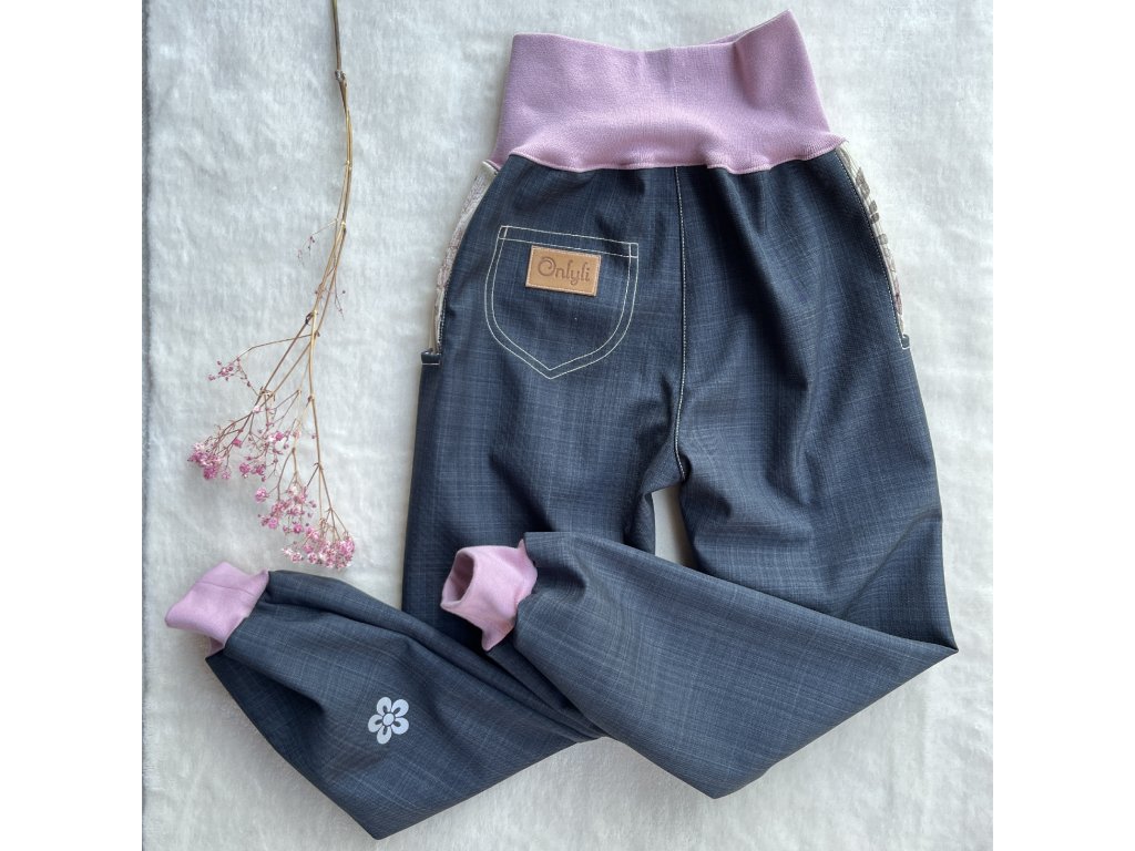 Nohavice a pas jsou všité do pružného elastického bavlněného lemu růžové barvy, v pase otvor na upravitelnou gumou pro regulaci šíře.