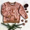 Mikina je u krku, dole a na rukávech lemovaná pružným bavlněným karamelovým úpletem a je ideální i do kočárku - bez kapuce nevadí miminku při ležení na zádech.