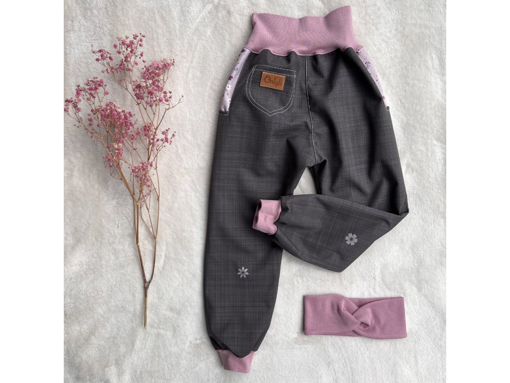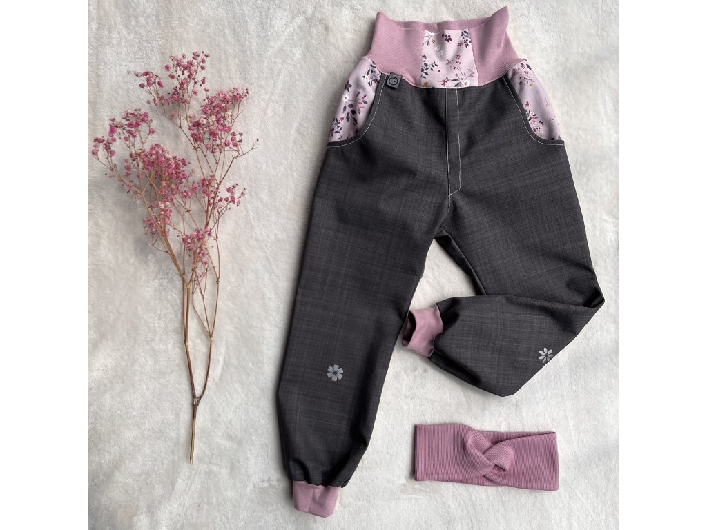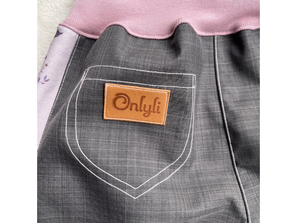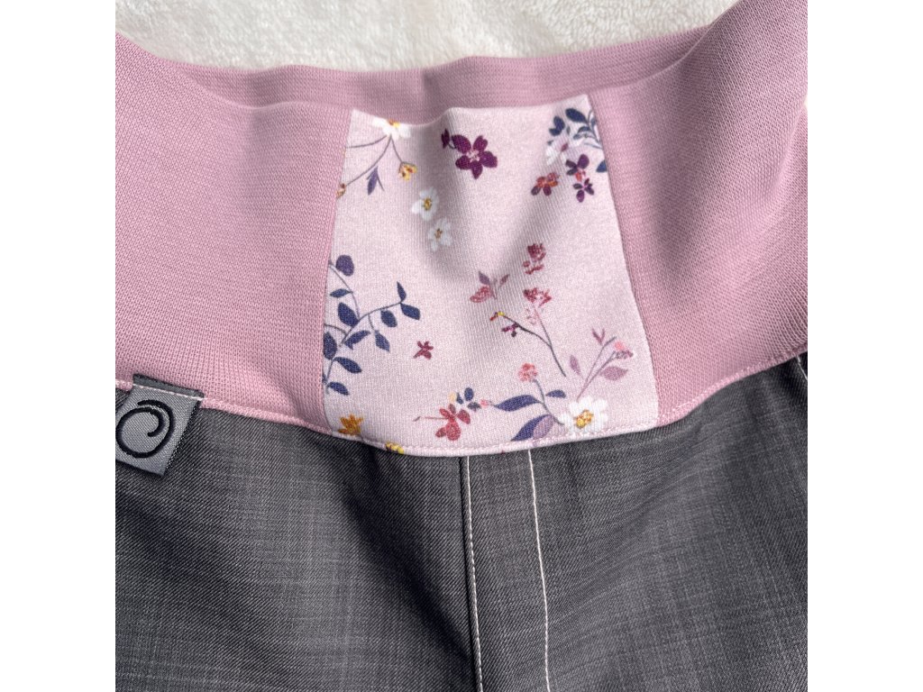 Nohavice a pas jsou všité do pružného elastického bavlněného lemu růžové barvy, v pase otvor na gumou pro regulaci šíře.
