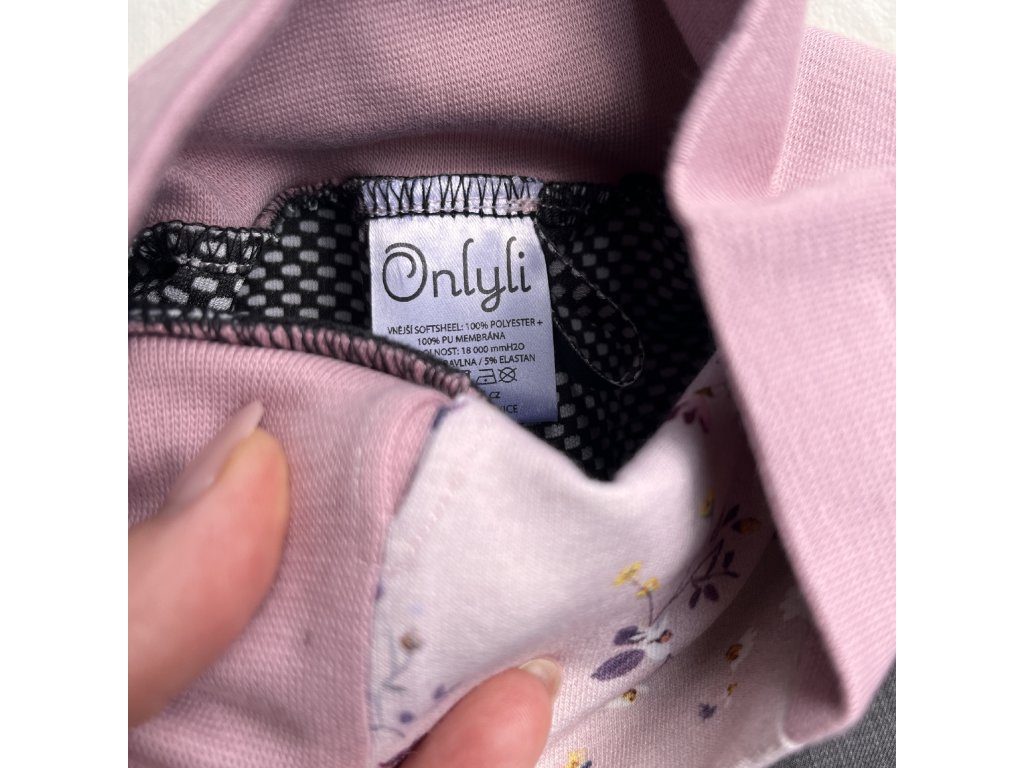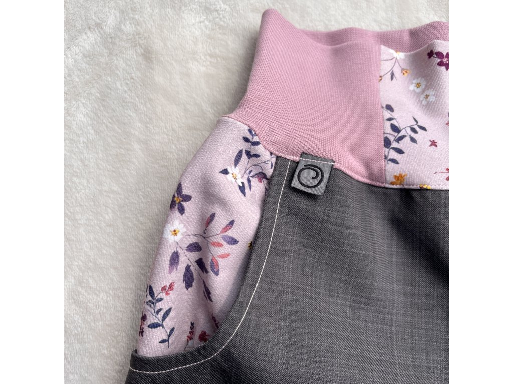 Od velikosti 92/98 velké funkční kapsy s obrázky květinek z el. biobavlny na předním díle, minimum švů. Ozdobné prošití barevnou nití a natavené reflexní prvky.